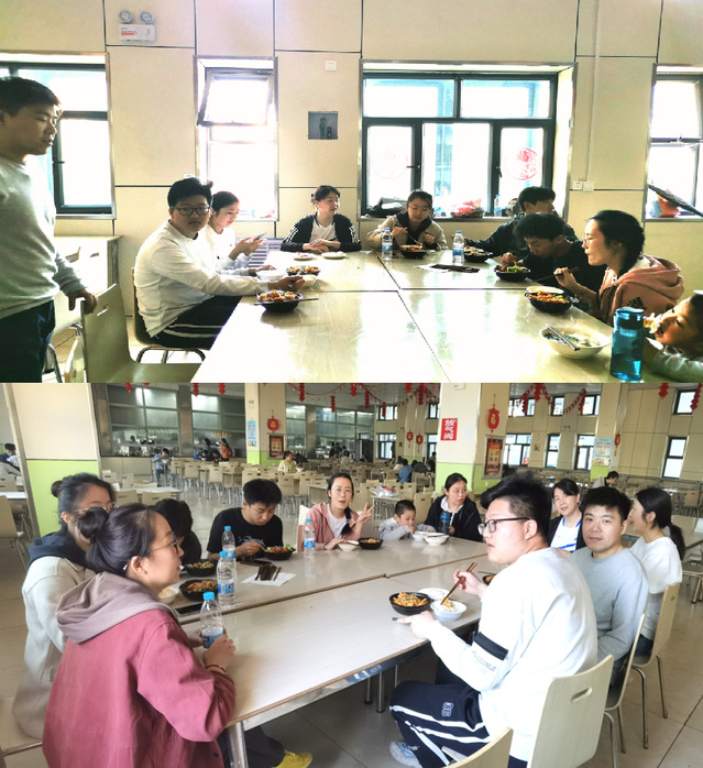 老师和同学们在食堂共进了晚餐,大家边吃边聊,老师们了解了学生的学习状态,也关注了他们的生活情况,希望他们在大学的时光中多汲取知识,不忘初心,也要加强身体锻炼,注重身心健康。通过本次活动又进一步增进了师生间的情感和凝聚力。