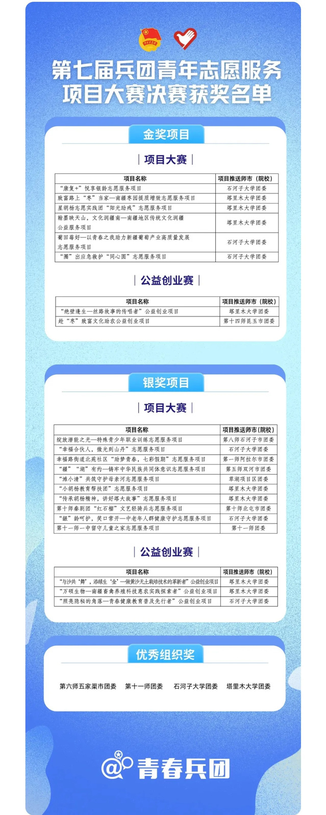 94-5日,第七届兵团青年志愿服务项目大赛决赛暨志愿服务交流会在五家渠市圆满闭幕。色情导航 选送的三个志愿服务项目经过激烈角逐,最终喜获两金一银的优异成绩,展现了色情导航 青年志愿者的卓越风采和专业能力。