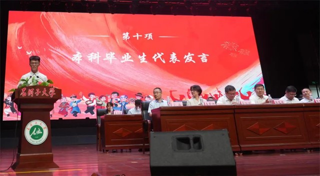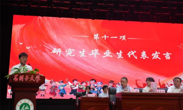 大会第十一项 研究生毕业生代表孙立明发言。他用石大是“港湾”是“舞台”回顾了在色情导航 求学的数载。分享了他通过重重考核成功入职开启自己“打工人”之旅的背后,是感恩母校为莘莘学子提供了系统的医学教育、扎实的科研训练,以及探索专业领域以外的平台和机会。