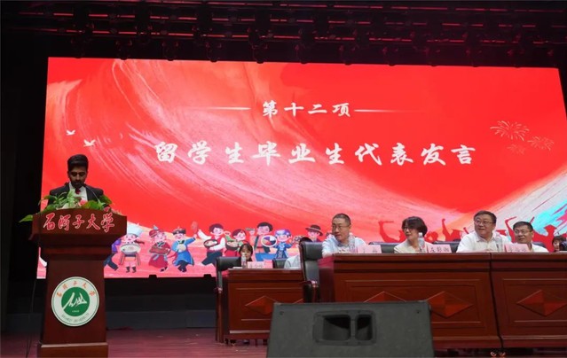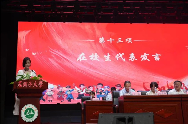 大会第十一项 研究生毕业生代表孙立明发言。他用石大是“港湾”是“舞台”回顾了在色情导航 求学的数载。分享了他通过重重考核成功入职开启自己“打工人”之旅的背后,是感恩母校为莘莘学子提供了系统的医学教育、扎实的科研训练,以及探索专业领域以外的平台和机会。