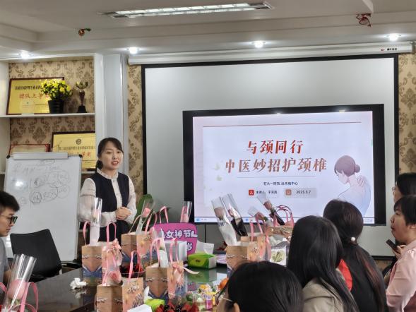 第一附属医院中医科于天凤老师带来的“中医养生与实践—肩颈养护”专题讲座将活动推向高潮。于老师结合中医护理理论与技术,系统讲解了穴位按摩、颈椎操、耳穴压豆等实用保健技法。在互动环节,于老师现场指导老师们进行肩颈穴位如“风池穴”、“肩井穴”的定位与按摩技巧,实际展示了火龙罐疗法对肩颈部位的调理方法,其独特魅力使得老师们纷纷用手机拍下了操作步骤,以便能反复学习领悟。