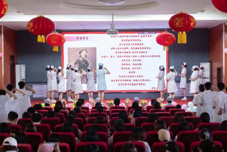 护理学系在南区学术报告厅隆重举办护士节授帽仪式暨文艺汇演。学院领导、附属医院护理部主任和护理系全体师生参与此次活动。