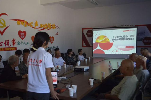 活动在连队文化活动中心拉开序幕,实践团队成员首先向在场居民介绍了此次宣讲的目的——通过解读民族团结的核心内涵,分享身边的民族团结故事,让“中华民族一家亲”的理念更加深入人心。宣讲人以“石榴籽心连心:我们眼中的民族团结故事”开篇,宣讲过程中,团队成员紧扣“铸牢中华民族共同体意识”主线,将理论知识与连队实际相结合。他们先是用通俗易懂的语言讲解了“三个离不开”“五个认同”等核心概念,避免了生硬的理论灌输,为了增强互动性,团队还设置了知识问答环节,同时团队还准备了印有民族团结标语的小礼品送给大家。