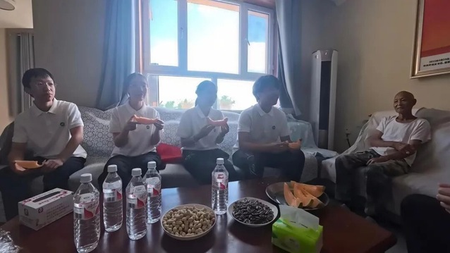踏入小屋,温情扑面而来。得知实践团远道而来,魏德友老人与妻子刘景好热情招待了实践团一行。岁月染白了他们的双鬓,风霜刻深了他们的皱纹,但那朴实笑容里绽放的热情,瞬间融化了实践团的一路疲惫。魏老步伐稳健地迎上前,伸出粗糙却有力的大手与每一位实践团成员紧紧相握。刘景好老人则慈祥地笑着,连声招呼:“孩子们,累了吧,快进屋歇歇,喝口水!吃瓜!”