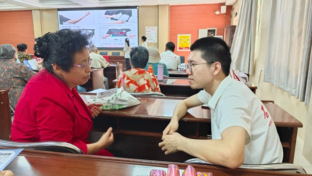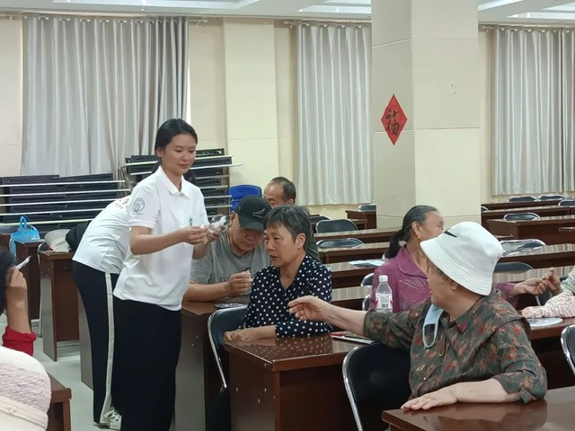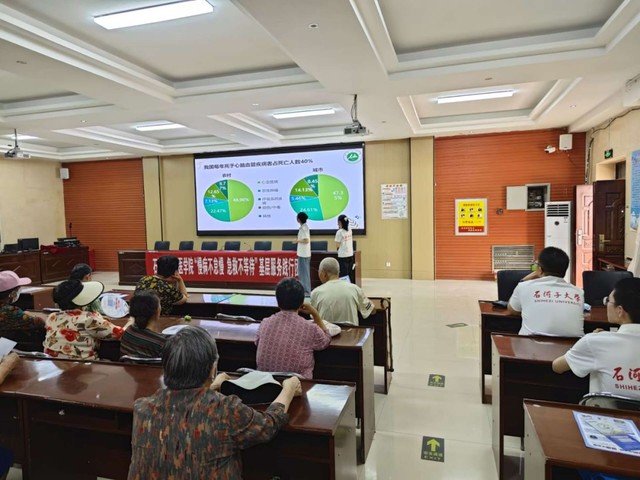 下午4时,活动在社区活动室准时拉开帷幕。面对台下以中老年群体为主的听众,团队成员特意调整讲解节奏,结合PPT、动态图表与真实案例,用“口语化表达”开启首讲。从“四高”疾病的现状、预防措施,到血压血糖仪的使用方法,进行了细致讲解。台下的居民们听得格外认真,坐在前排的一位叔叔更是拿出随身携带的笔,时不时低头快速记录,遇到关键数据还特意举起手机拍来,生怕漏过任何一个知识点。