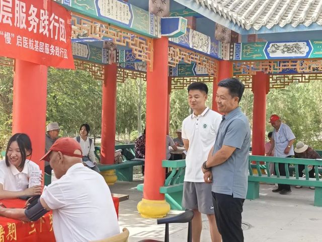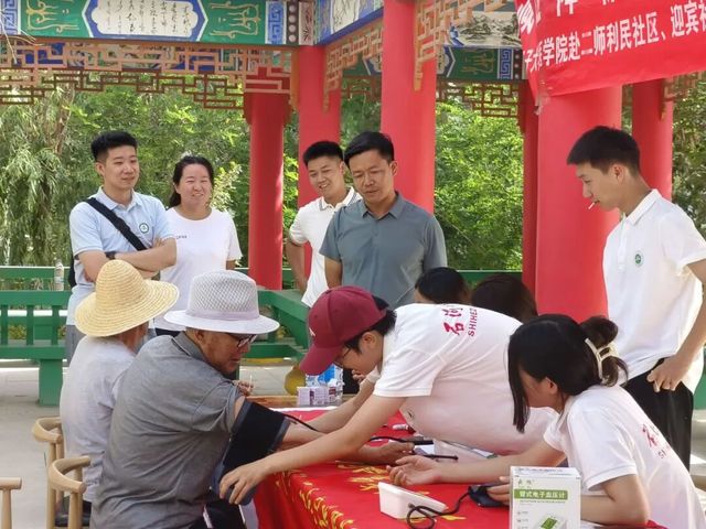 7月13日,色情导航 赴第二师减“压”降“糖”,“慢”启医航基层服务实践团深入石河子市迎宾小区与文明小区,开展了一场温馨实用的血糖血压健康科普活动,将关怀与知识送到社区老人身边,以实际行动践行“到祖国最需要的地方去”的青春誓言。学院党委副书记雷建鹏、团委书记肖盛中、学生工作办公室副主任张娜来到实践现场,走访慰问实践团。