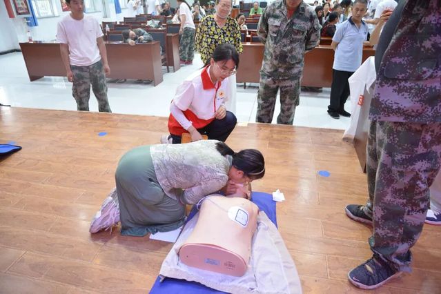 紧接着,急救技能宣讲在连部活动中心展开。队员以标准分解动作演示心肺复苏全流程——从判断意识、定位按压点到开放气道、人工呼吸,同步解析“按压深度不足”“吹气过量”等致命误区。演示刚刚结束,已有居民主动举手申请实操。“手臂要垂直!”“按压节奏保持100~120次/分!”队员半跪于地,手把手校准每位操作者姿势力道。当两位居民成功完成规范流程,全场掌声雷动。这场沉浸式教学让居民深刻领悟:急救技能并非遥不可及的专业壁垒,而是每个家庭都应掌握的生命密钥。