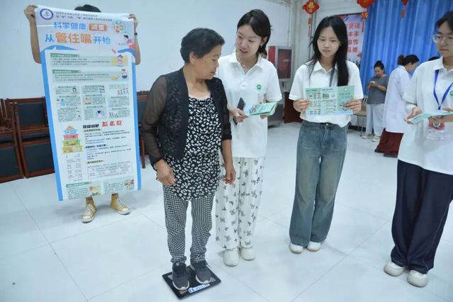 同步进行的BMI指数筛查区排起长队。团队成员携带卷尺、体重秤等设备,为每位居民现场测算并解读数据。“您的BMI 为26.3,属于超重,建议每日减少300大卡摄入。”团队将抽象数字转化为具体行动方案,结合个体情况推荐膳食调整与运动处方。和蔼的居民奶奶听着团队成员的介绍讲解,恍然大悟:“原来‘壮实’不等于健康!”筛查不仅提供即时健康评估,更成为营养宣讲的实践延伸。