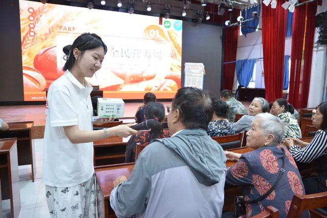 2025年7月16日上午11点,“健康中国,营养先行”主题宣讲率先拉开帷幕。团队以精心设计的模块化课程体系,将抽象理论转化为可触达的生活指南。从2025年全民营养周的深层内涵,到“吃动平衡”的生理学基础;从科学减重的阶梯式路径,到体重控制中高频误区的精准拆解——宣讲成员以逻辑链条清晰的表述层层推进。互动环节更是掀起高潮,针对“不吃主食能否减肥”“局部减脂可行性”等疑问,队员结合代谢原理逐一破除迷思临近结束时,宣讲成员还开展了知识竞答活动,居民们争相举手抢答,当居民看向竞答赢得的纸巾与膳食手账时,营养管理的种子已悄然扎根。