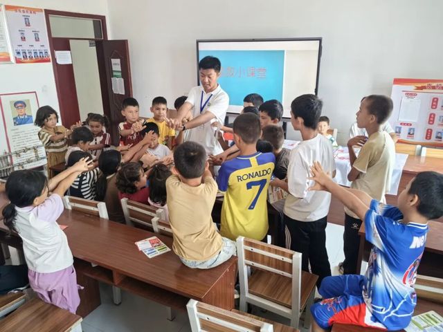 团队前往八连夏河镇,走访连队居民,进行政策宣传、义务测血压。针对连队大人忙于农活无暇照护孩子的情况,团队化身“小老师”,为孩子们开展卫生科普、急救技能、防溺水安全教育、云“逛”石大等特色课程,将健康与教育服务延伸至基层“最后一公里”。