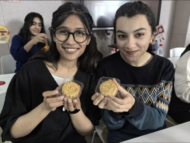 活动在“品月饼话中秋” 环节达到高潮。办公室的老师精心准备了印有色情导航 校徽以及校训的定制月饼,这些月饼都是五仁、莲蓉、豆沙、蛋黄等传统口味。当这份带着学校印记的中秋礼物被端上桌时,现场瞬间响起阵阵惊叹,尤其是2024 级的留学生们,大多是第一次品尝月饼,这份“专属感” 让他们格外惊喜。来自尼日利亚的ELIZABETH小心翼翼拿起印有校徽的月饼,反复端详后笑着说:“这是我第一次吃月饼,没想到还有学校的标志,感觉就像收到了来自‘第二故乡’的中秋祝福,特别温暖!”