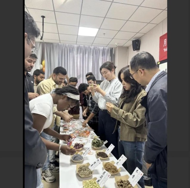本次活动的亮点是独具色情导航 特色的“巧手制香囊”环节。在老师的指导下,留学生们亲手挑选艾草、薄荷等中草药,一针一线地缝制起充满吉祥寓意的中秋香囊。这一活动不仅让他们体验了中国传统手工艺的乐趣,更将中医药文化知识融入其中,直观地感受到了中医“未病先防”的养生智慧。来自印度的SRUJAN同学拿着自己制作的香囊说:“这太神奇了!这些草药的味道让人心旷神怡,我终于亲手触摸到了在课本上学到的中药,这让我对中医文化更加着迷了。”