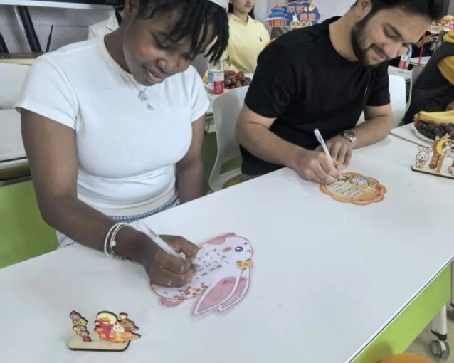 在“诗意中秋”环节,留学生们拿起纸笔,饶有兴致地临摹《静夜思》《水调歌头·明月几时有》等千古名篇。横竖撇捺的勾勒让他们切身感受到了中国汉字的独特魅力以及背后深厚的情感表达。