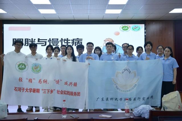 图为“轻‘脂’为纲,‘慢’减兴疆”实践团携手广东医科大学丝路医行实践团进行肥胖与慢性病宣讲