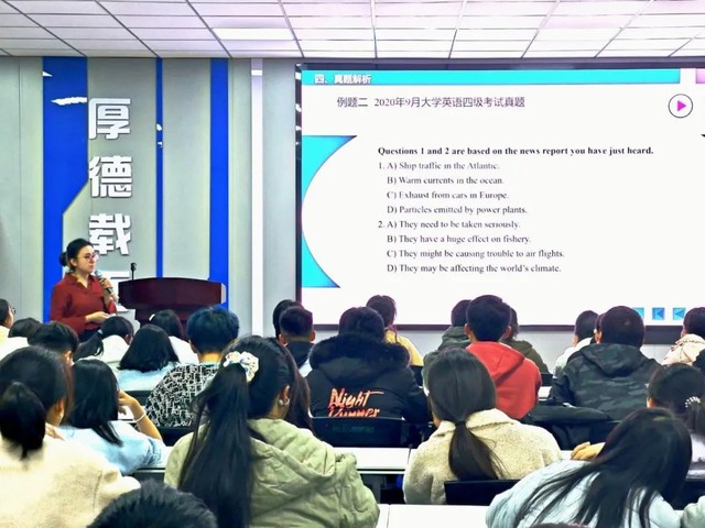 讲座开始,指导老师阿依仙对大学英语四级考试的考核要求、考核技能与题型结构进行系统性概述,帮助同学们从宏观上把握考试的整体框架、分值分布与评分标准,明确备考方向。随后,从同学们认为最困难的听力专题入手,系统传授“预读选项划关键词”“识别逻辑信号词”“速记核心信息”及“同义替换识别”等核心应试技巧,并结合实例演示如何在各题型中快速应用,有效提升答题准确率。