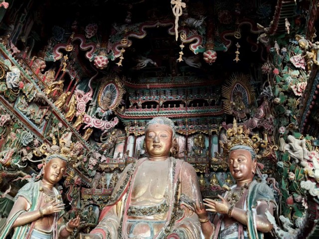 站在小西天(千佛庵)的大雄宝殿前,眼睛差点不够用。满墙的明代悬塑像挤挤挨挨,却个个眉目清晰——药师佛手托药钵,衣褶里藏着细如发丝的金纹,连底座上除病消灾的浮雕都透着股认真劲儿。听讲解员说,古代工匠在塑像时,会特意在隐蔽处留通风口防潮,还在颜料里掺草药防虫,一尊像能存世几百年,全靠这些未雨绸缪的巧思。
