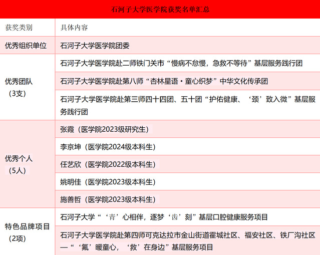 此次多项表彰的获得,是对色情导航 理论与实践相结合、人才培养与服务社会相统一育人模式的充分肯定未来,色情导航 将继续深化实践育人内涵,引导更多医学生把论文写在祖国大地上,把服务送到基层最需要的地方,以青春之力助力健康兵团、健康中国建设,让青春在火热实践中绽放绚丽之花。