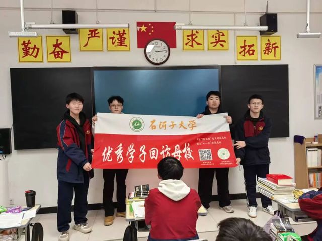 宣讲核心环节,我们聚焦同学们最关心的升学问题展开详细解读。我和伙伴们通过实拍视频与图片,全方位展示了石大“春有百花、夏有绿荫、秋有银杏、冬有白雪”的校园环境,重点介绍了学校的交通优势——紧邻城市主干道、公交直达校园,高铁与飞机可快速通达全国,为学子出行与研学提供便利。针对王牌专业特色、报考政策细则、志愿填报技巧以及大学生活规划等高频问题,我们结合自身求学经历逐一答疑解惑,用真实案例帮同学们破除迷茫、明晰方向。