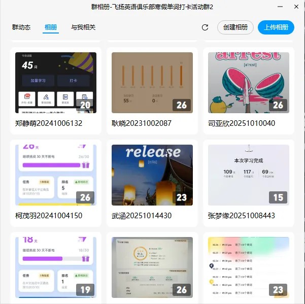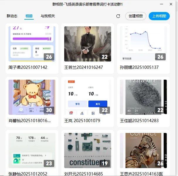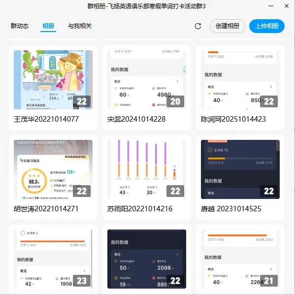 本次活动于2026年2月1日至2月26日在线上开展,持续26天。参与者需通过主流单词学习软件(如百词斩、墨墨背单词、扇贝单词、不背单词等)完成每日至少40个新单词的学习任务,并在每日8:00至22:00,将包含日期的学习记录截图上传至活动QQ群的个人相册中。据统计,共有355名同学报名参与,活动结束后仍有不少同学自发延续打卡,展现出持续学习的热情与韧劲。