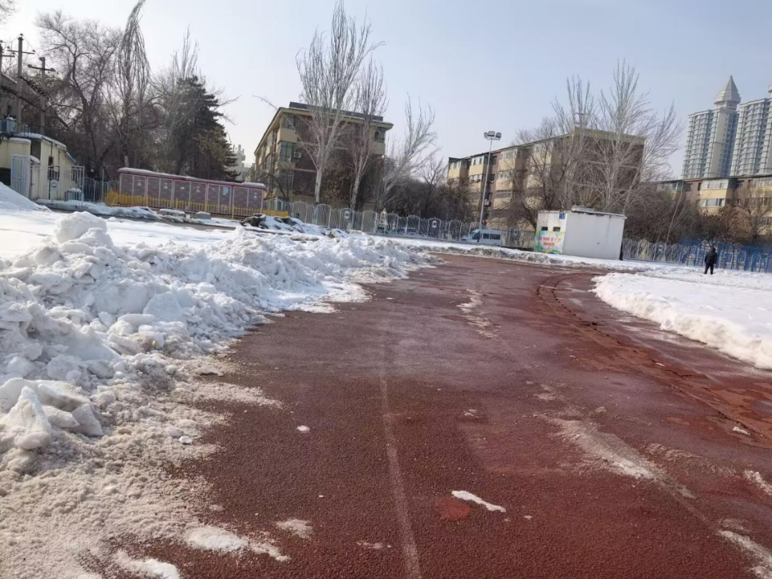 经过一下午的辛勤劳动,南区操场跑道中央的积雪被全部清理至两侧,原本狭窄湿滑的道路变得宽阔通畅,校园面貌焕然一新。